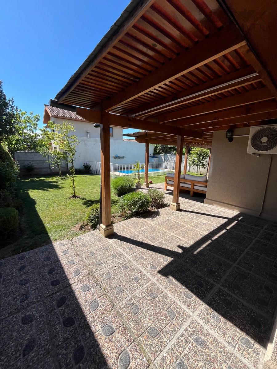 Lindo jardín con riego automático y terraza techada, piscina con reja de seguridad.